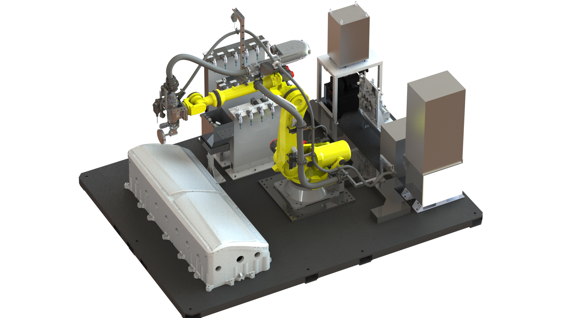 整套系統由2臺機器人組成,分別是P-1000iA噴涂機器人和P-35iA開蓋機器人。噴涂機器人用于車身內、外表面噴涂的作業,開蓋機器人用于打開引擎蓋的操作